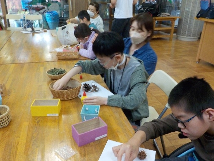 小枝やまつぼっくりなどを使って、それぞれすてきな作品を作り上げました。
