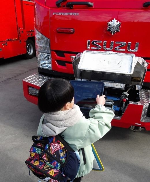 間近で見る消防車両は大迫力!レスキュー車の特別な設備に興味津々で見学していました。