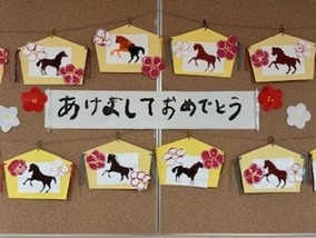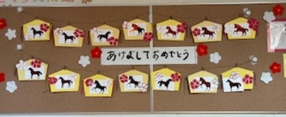 型紙に絵の具をスタンプして「馬」を、丸を5つ組み合わせてスタンプして「梅」を作りました。今年は馬年!良い年になりますように…!